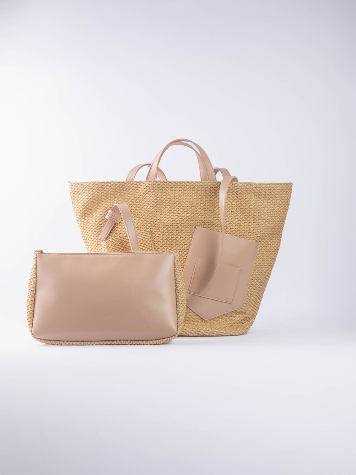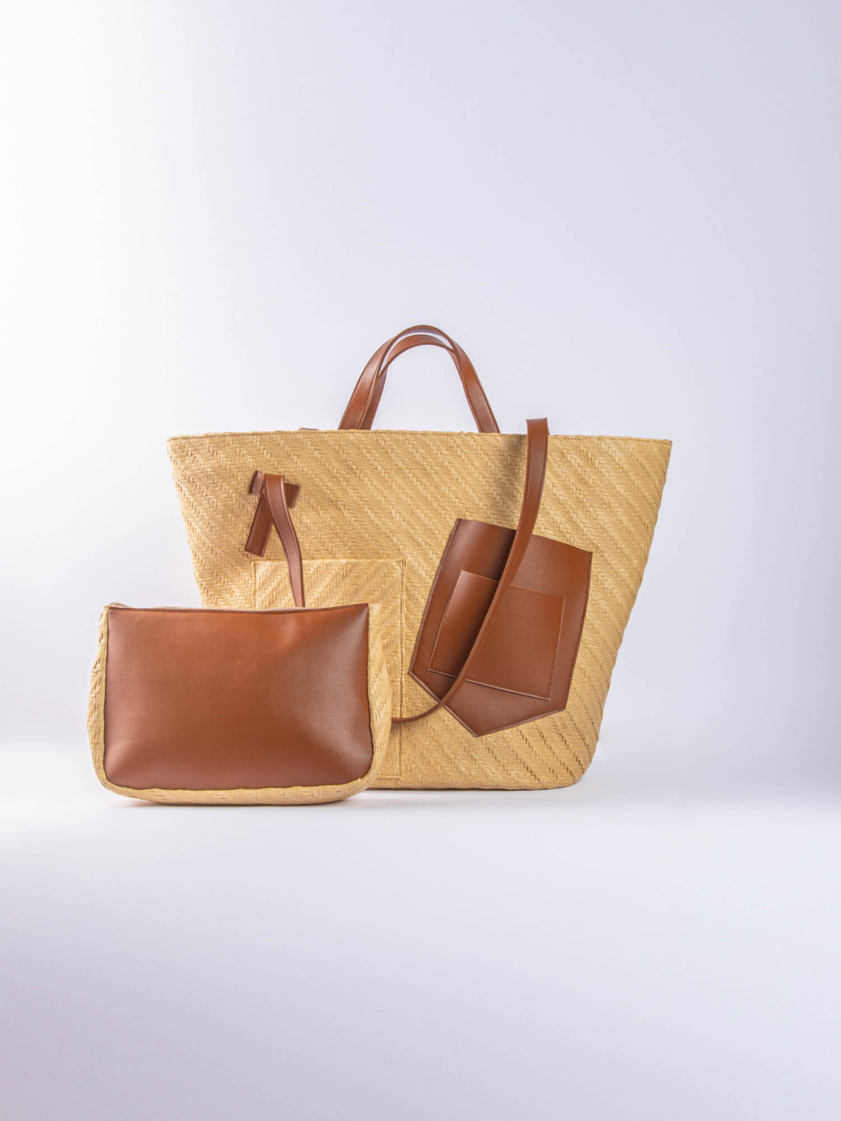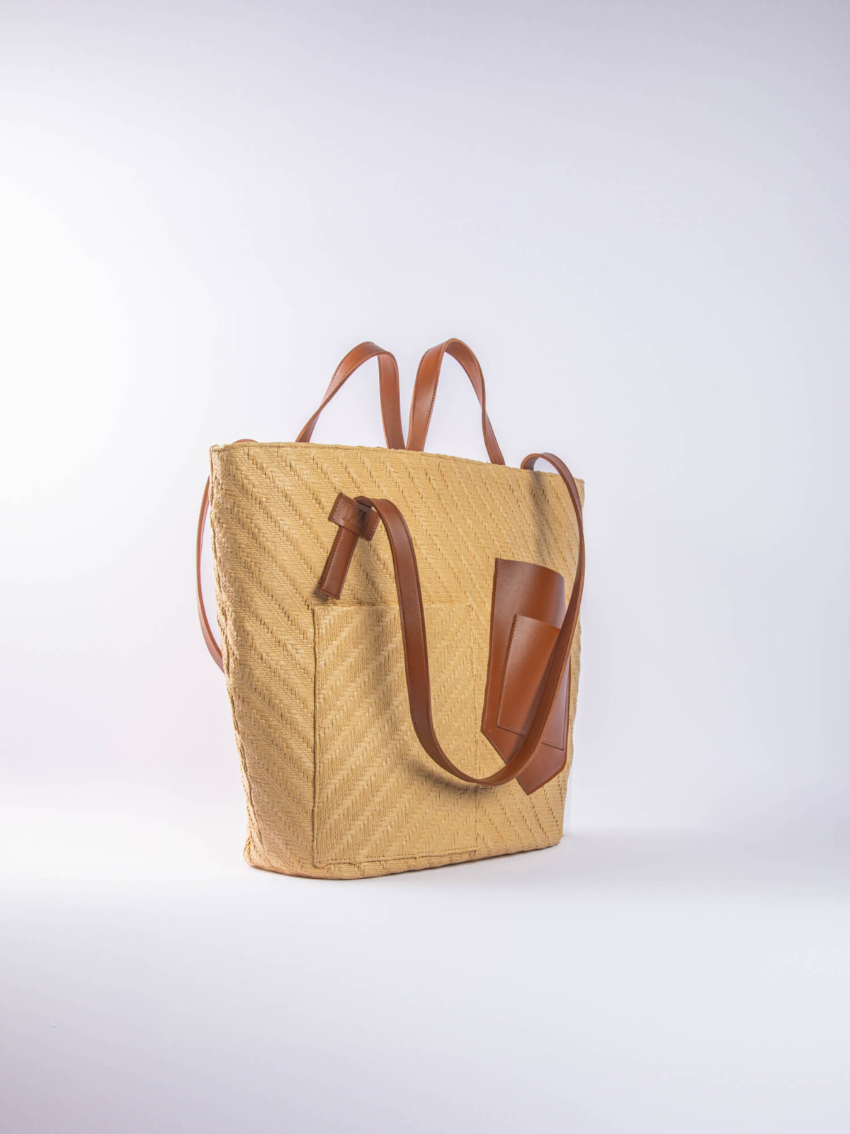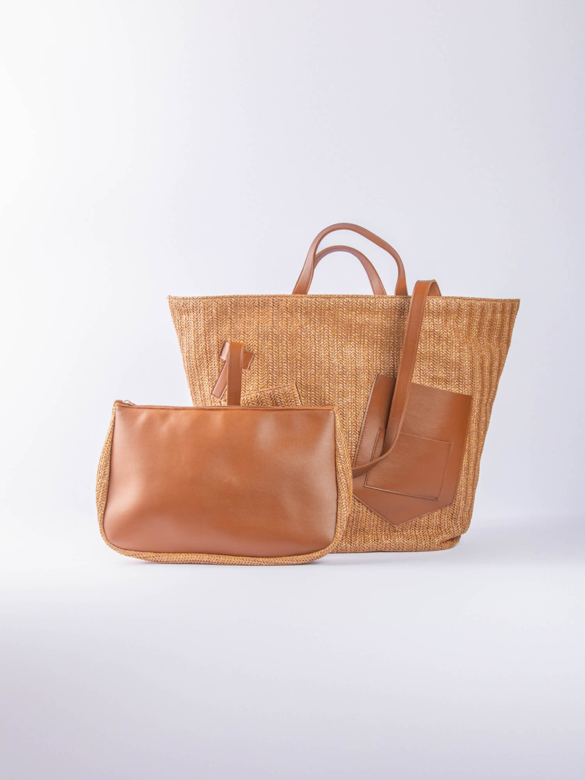 The Palm Beach Bag, designed from raffia and vegan leather.