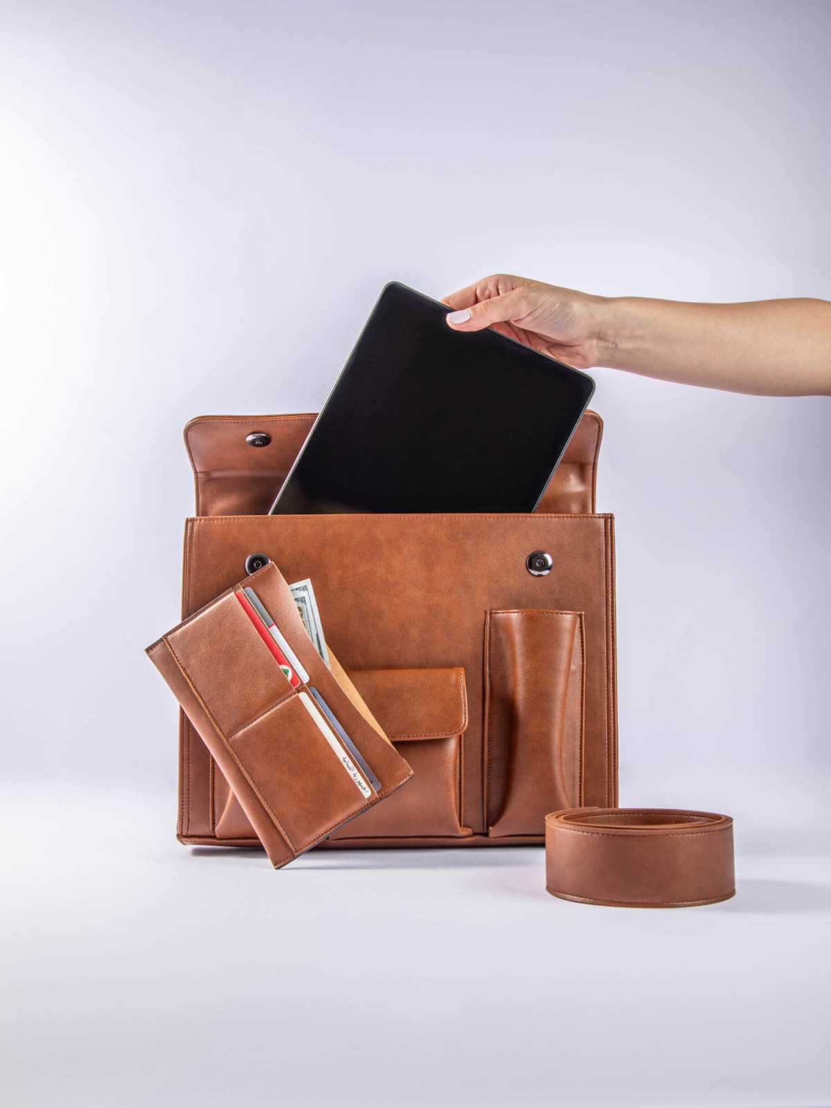 The ultimate vegan work bag – now paired with a matching wallet, offered as a gift.